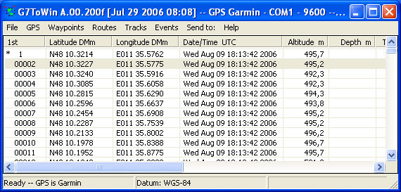 Als erstes müssen die Trackdaten vom GPS-Gerät auf den PC überspielt werden. Bei neueren GPS-Geräten ist das ganz einfach, da diese den internen Speicher beim Anstecken an den USB-Port des PCs als eigenes Laufwerk darstellen, als Laufwerk E: zum Beispiel. Dann kann die GPX-Datei einfach auf den PC kopiert werden. (Bei neueren Garmingeräten liegt die aktuelle Trackaufzeichnung zum Beispiel hier: "E:\Garmin\GPX\Current/Current.gpx" wenn E: das gemountete GPS-Gerät ist.) Für ältere Geräte, die entweder GPX nicht direkt schreiben können oder sich nicht als eigenes Laufwerk am PC zeigen, muss eine geeignete Software dafür verwendet werden, um die Tracks auf den PC zu bekommen. Dies geschieht zum Beispiel mit G7ToWin. Schließen Sie das GPS-Gerät an den PC an, schalten Sie es ein und starten Sie G7ToWin.
