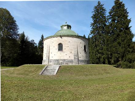 Dieses Wasserschloss ist kein herrschaftliches Anwesen, wie der Name vermuten lassen könnte, sondern ein Schachthaus zur Grundwasserfassung. Baulich ist es aber trotzdem sehr imposant. Weiter geht es auf der anderen Seite des Wasserschlosses. Wenn wir mit dem Rücken zur breiten Haupttreppe stehen, dann ist der Weg rechts die richtige Wahl. Nach wenigen Minuten erreichen wir eine Abzweigung mit Hinweisschildern (M269). Hier biegen wir links ab auf Weg Nummer 550 in Richtung Thalham und Mühltal.