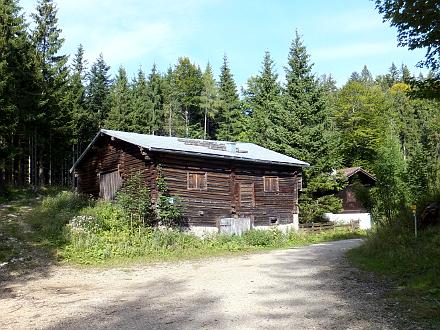 Ca. 1100m Strecke und fast 100 Höhenmeter sind es zur Klammalm - dem nächsten markanten Wegpunkt (bei R136). Auch die Klammalm bietet keine Einkehrmöglichkeit. Wir folgen weiter dem Waldweg und erreichen nach wenigen Schritten den Scheitelpunkt unseres ersten Wanderabschnitts auf ca. 1160m Höhe. Von hier aus geht es jetzt erst mal wieder 60 Höhenmeter abwärts. Die unteren 20 Höhenmeter können wir (bei Wegpunkt R156) links über einen schmalen Waldsteig abkürzen. Allerdings ist dieser Steig nicht beschildert und schwer zu erkennen. Wer ihn mangels GPS-Gerät nicht findet, läuft einfach auf der Forststraße weiter und folgt der Ausschilderung zur Hohen Asten. Alle Wege treffen sich wieder an der Stelle, wo der Weg von der Tatzelwurmstraße herauf kommt. Weiter geht es nach Westen Richtung Hohe Asten und von hier an wieder deutlich aufwärts. Keinen halben Kilometer weiter (bei GPS Wegpunkt R169) gabelt sich dann die Forststraße ohne Beschilderung. Lediglich ein Holzpfahl mit rotem Punkt legt nahe, dass wir uns rechts aufwärts halten. 120m weiter kommen wir an eine Wegkreuzung, die ebenfalls nicht beschildert ist (R172). Rechts ginge es direkt zur Hohen Asten, wir wollen aber zuerst auf den Rehleitenkopf. Dazu gehen wir geradeaus bzw. halb links.